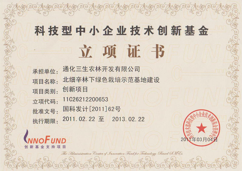 創(chuàng)新基金立項(xiàng)證書